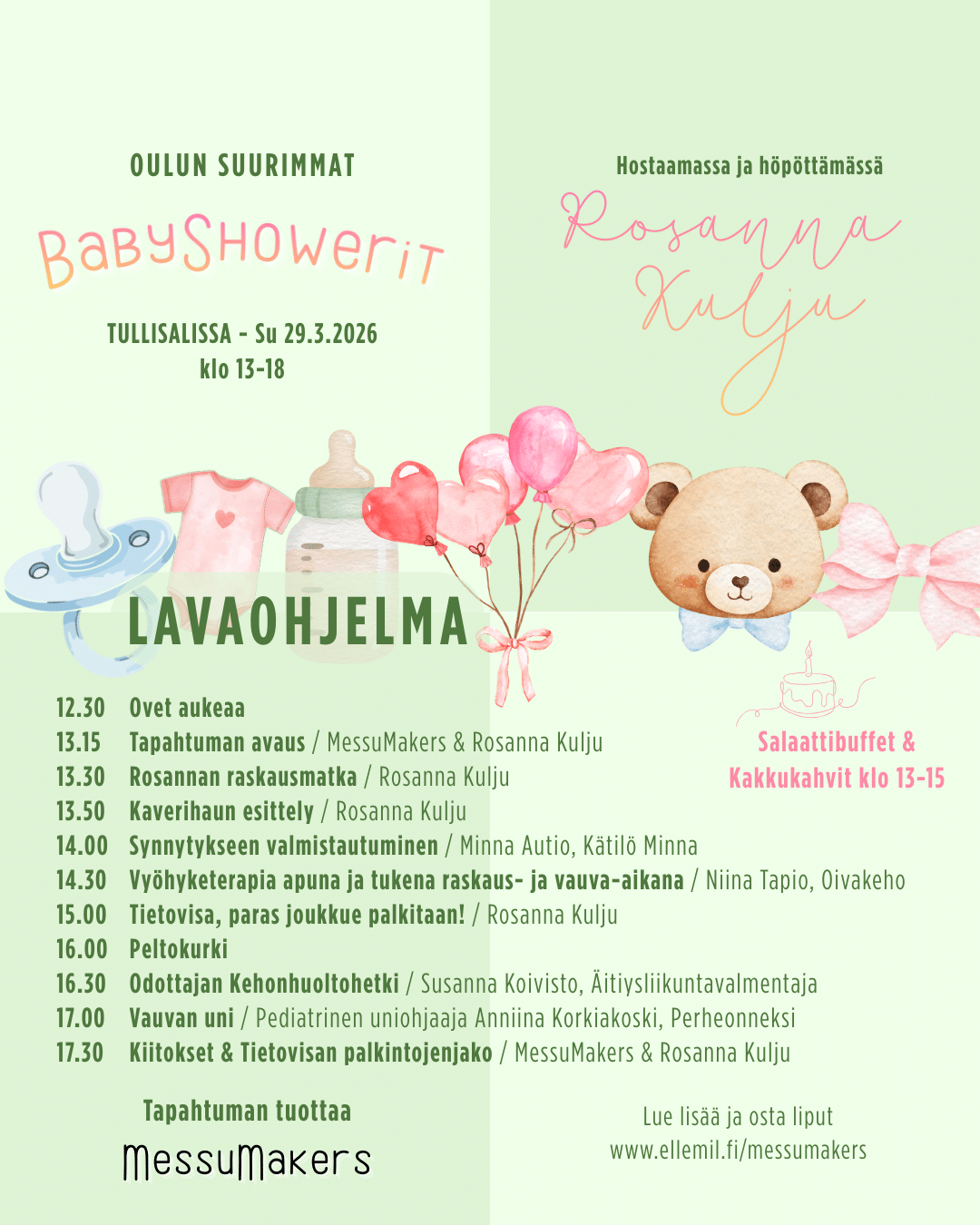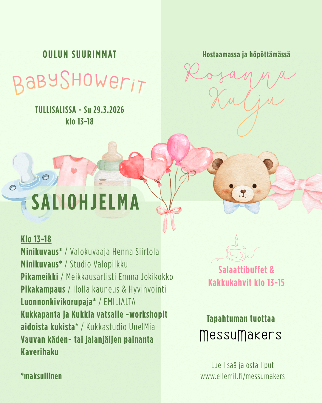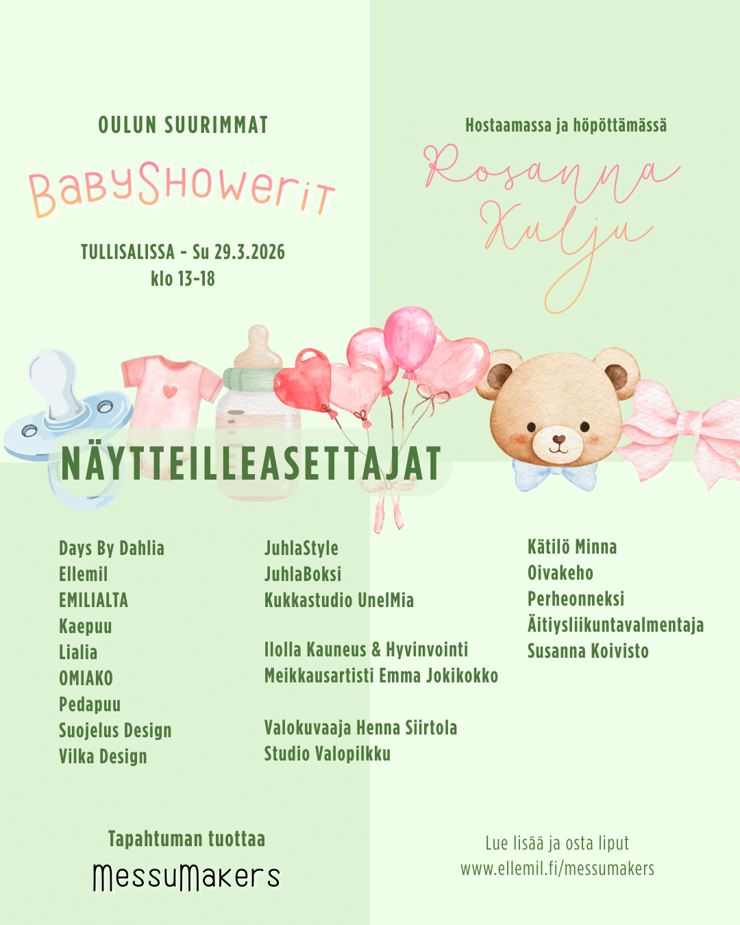 Oulun Suurimmat BabyShowerit Tullisalissa, sunnuntaina 29.3.2026. Tapahtumassa hostaamassa ja höpöttämässä sädehtivä Rosanna Kulju!