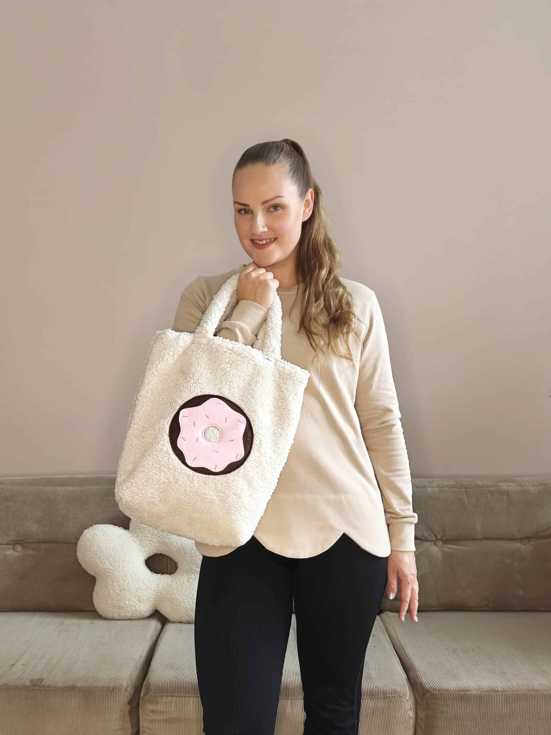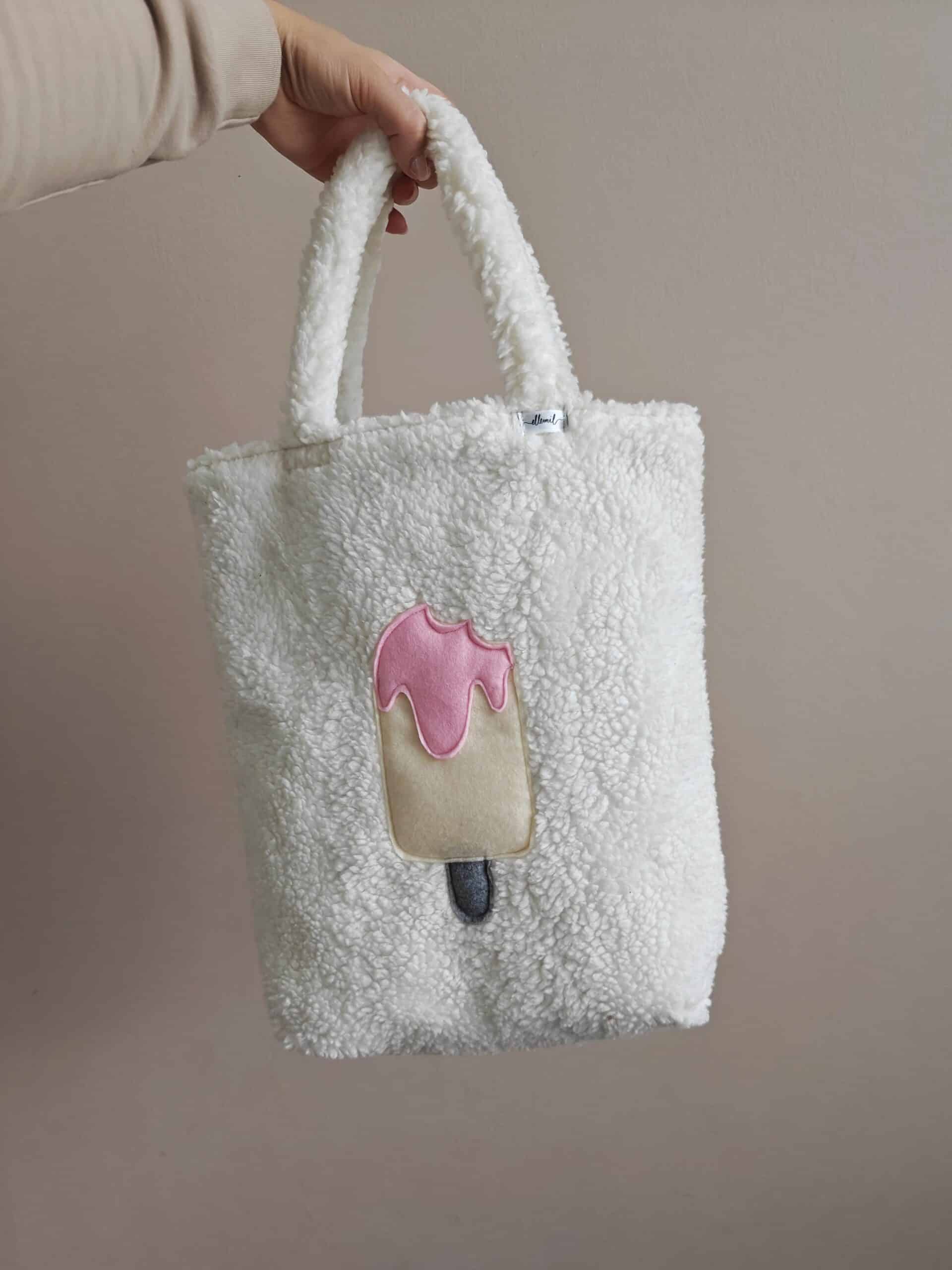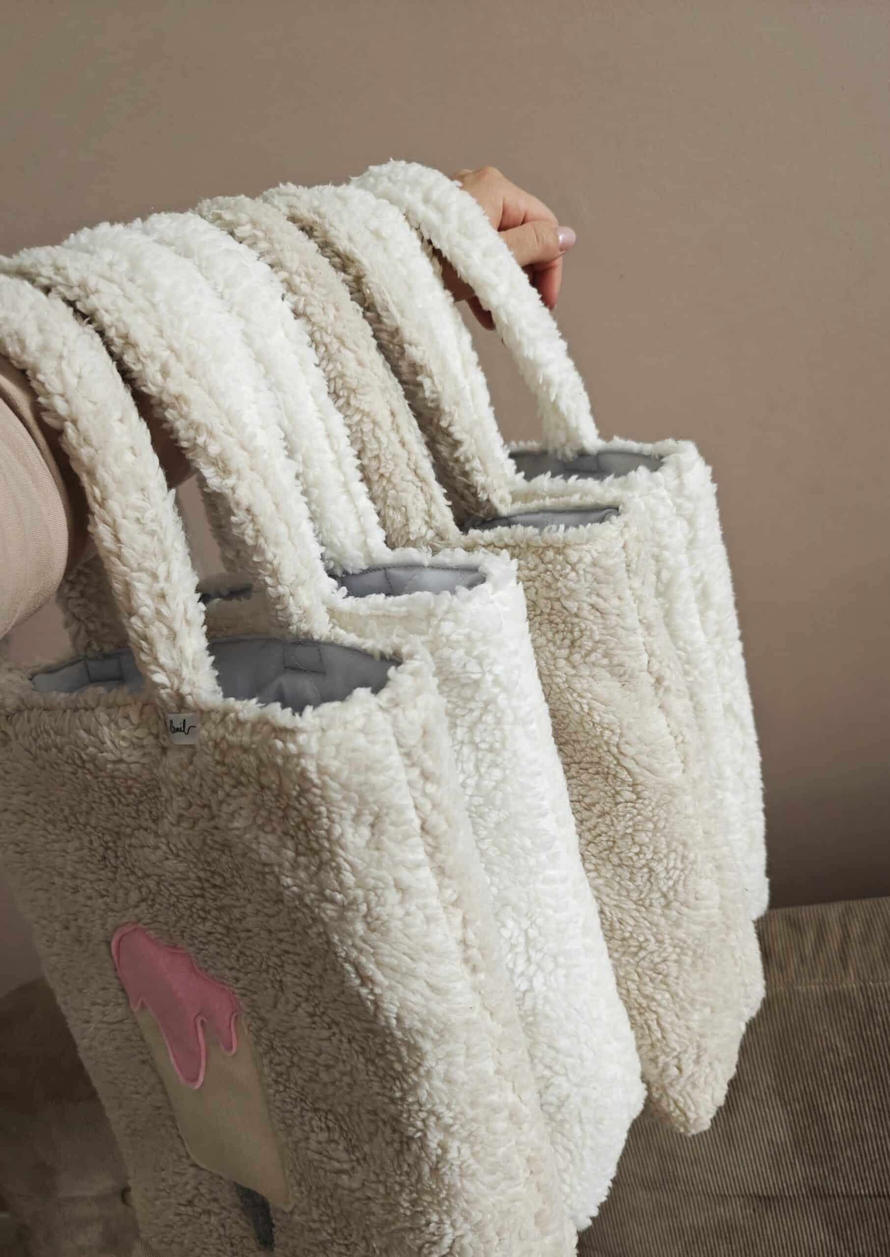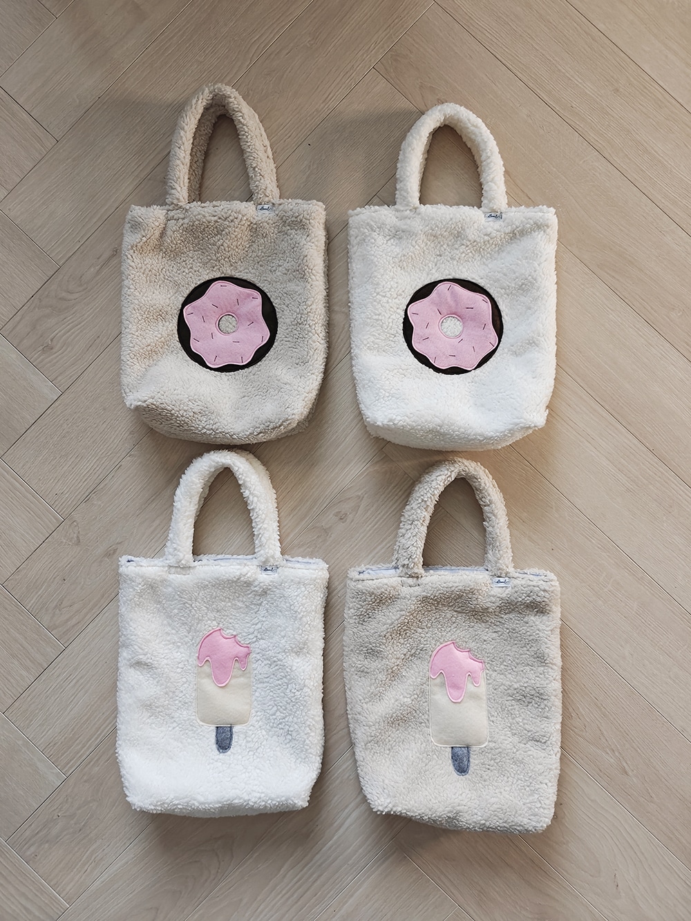 Ihanan pörröinen ja pehmoinen Teddy Laukku sopii sekä aikuisille, että lapsille! Kassiin sopii läppäri, tabletti, kirja tai se kuuluisa kolmen kopla: puhelin, lompakko ja avaimet, mitä viimeisenä kotiovella taskuista tunnustellaan. Lapsella kassi voi olla automatkalle lelukassi, kirjastokassi tai weekend bag isovanhemmille. Tätä Laukkua on myös ihana halia, se on niin mukavan pehmoinen. Teddy Laukkuja on kahta sävyä: beige ja valkoinen ja Jätskin lisäksi valittavana on Donitsi -kuvio. Kuvissa mallilla on asusteenaan beige laukku donitsilla. Valkoinen Taddy Laukku on heti toisena kuvana. Valkoinen je beige on sävyinä melko lähellä toisiaan. Erotat sävyt toisistaan parhaiten kuvasta, jossa on kaikki neljä erilaista laukkua.