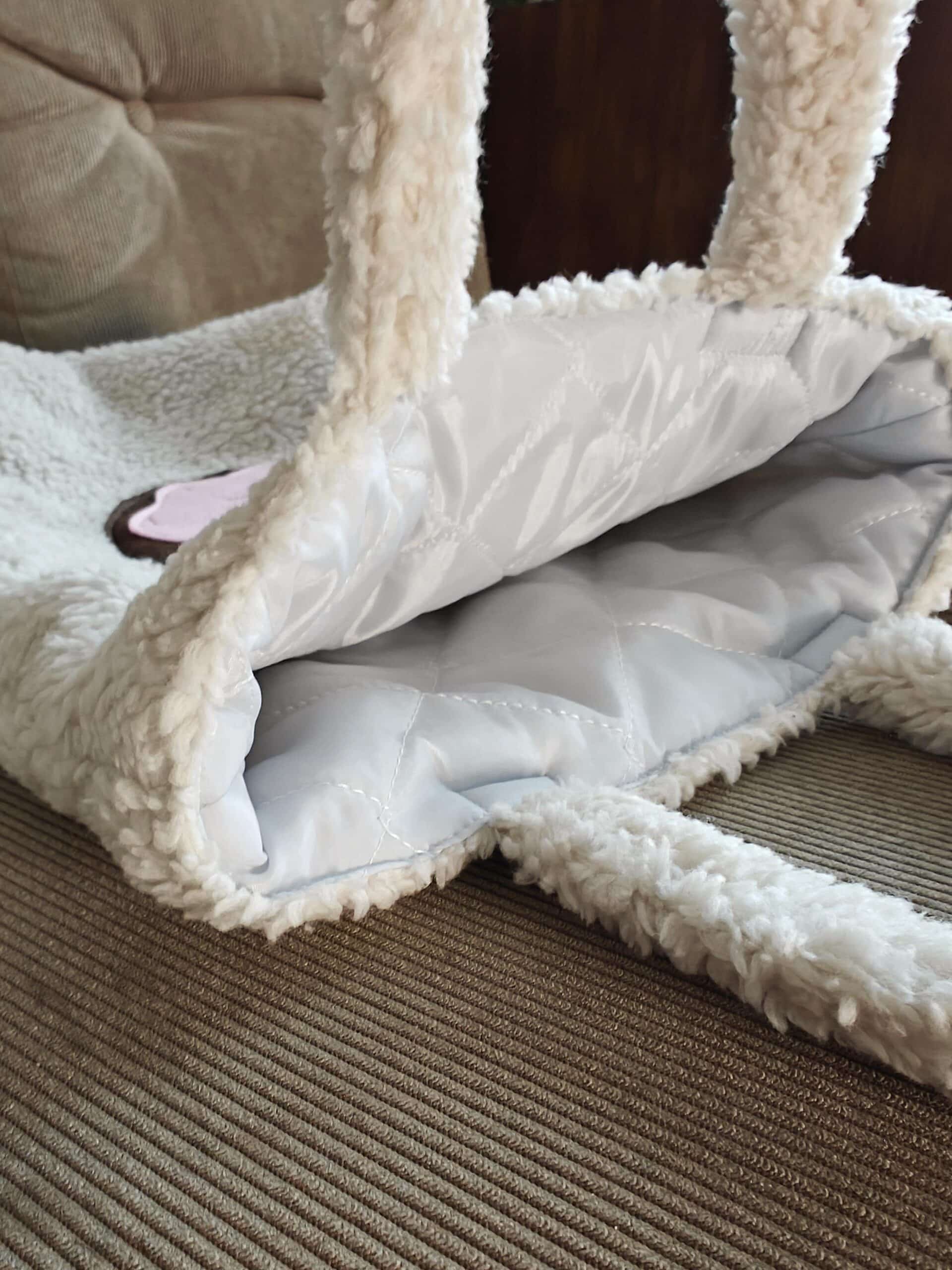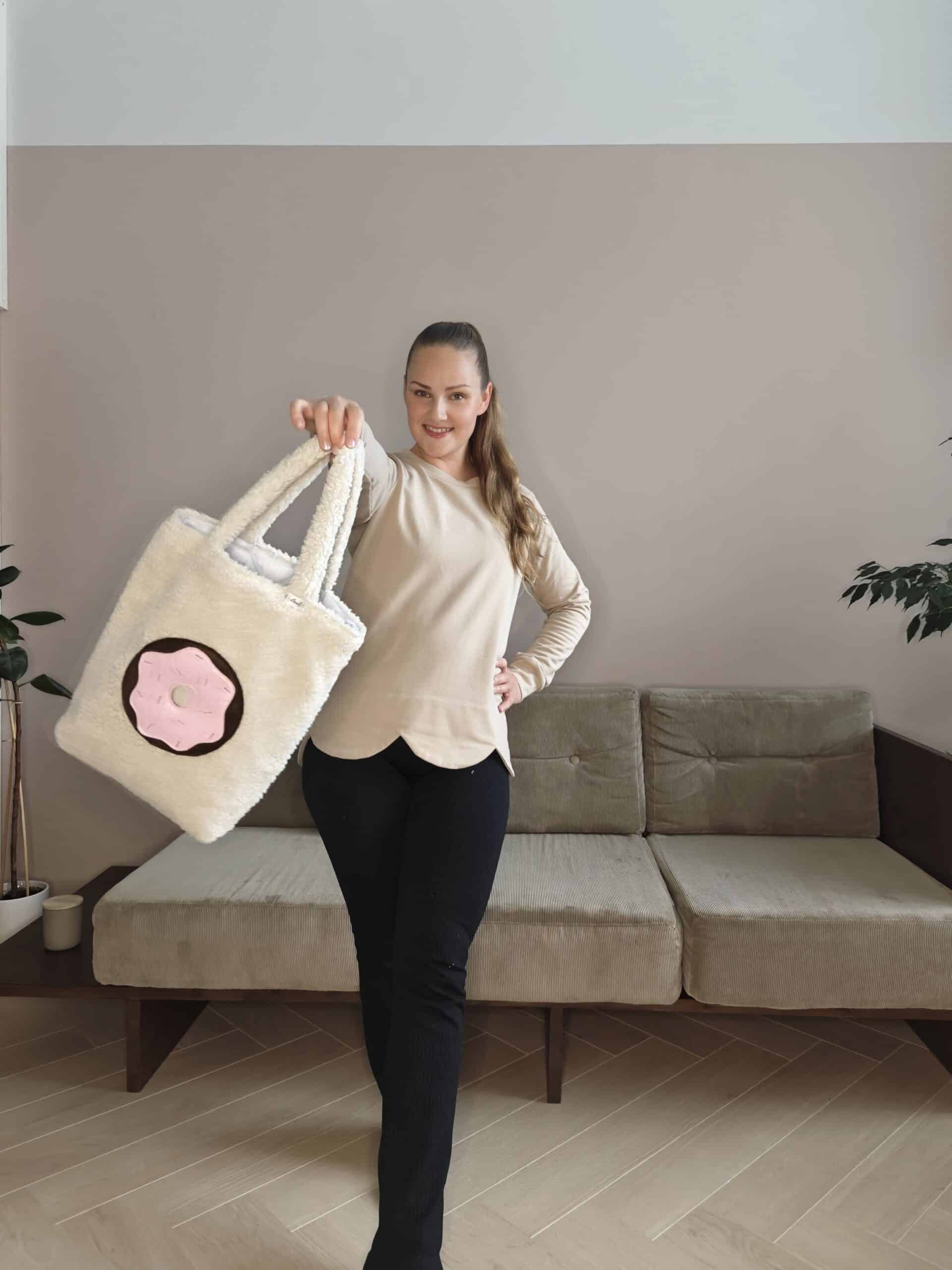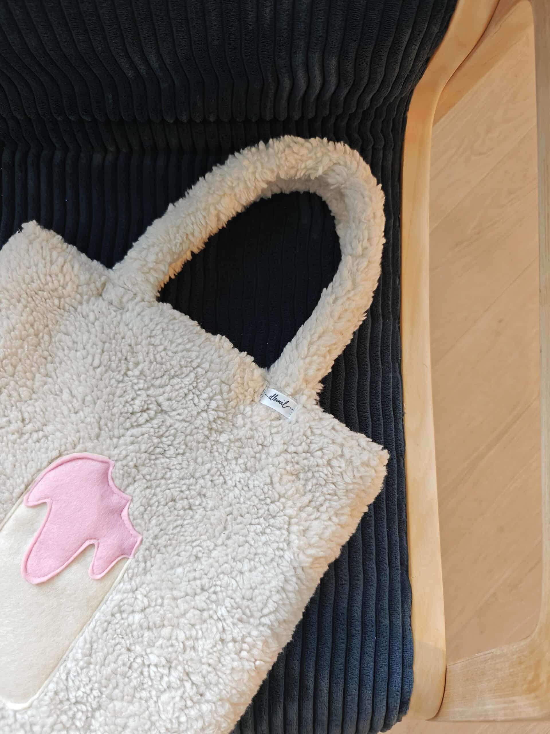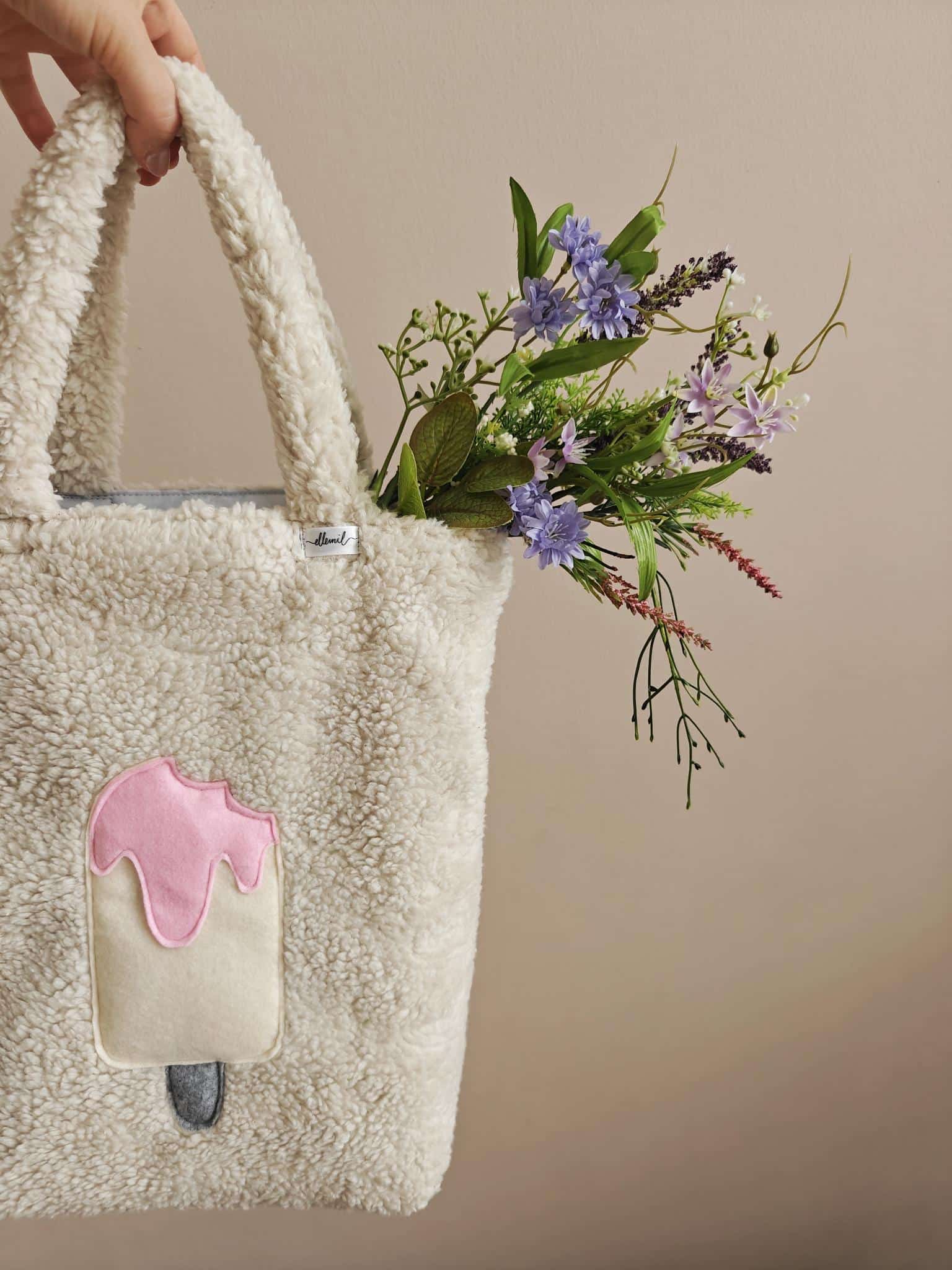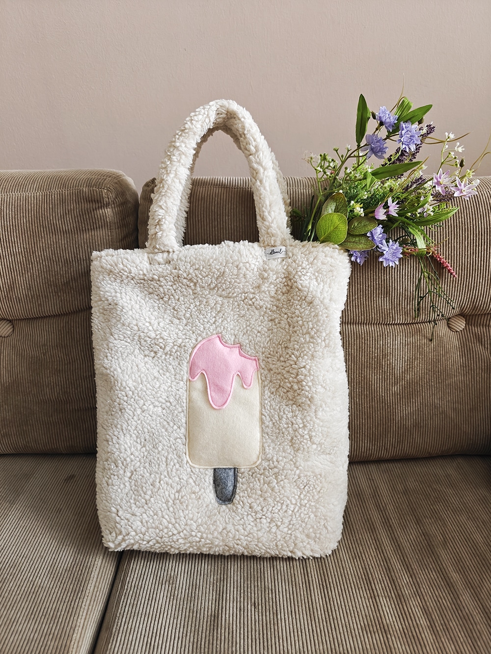 Ihanan pörröinen ja pehmoinen Teddy Laukku sopii sekä aikuisille, että lapsille! Kassiin sopii läppäri, tabletti, kirja tai se kuuluisa kolmen kopla: puhelin, lompakko ja avaimet, mitä viimeisenä kotiovella taskuista tunnustellaan. Lapsella kassi voi olla automatkalle lelukassi, kirjastokassi tai weekend bag isovanhemmille. Tätä Laukkua on myös ihana halia, se on niin mukavan pehmoinen. Teddy Laukkuja on kahta sävyä: beige ja valkoinen ja Jätskin lisäksi valittavana on Donitsi -kuvio. Kuvissa mallilla on asusteenaan beige laukku donitsilla. Valkoinen Taddy Laukku on heti toisena kuvana. Valkoinen je beige on sävyinä melko lähellä toisiaan. Erotat sävyt toisistaan parhaiten kuvasta, jossa on kaikki neljä erilaista laukkua.